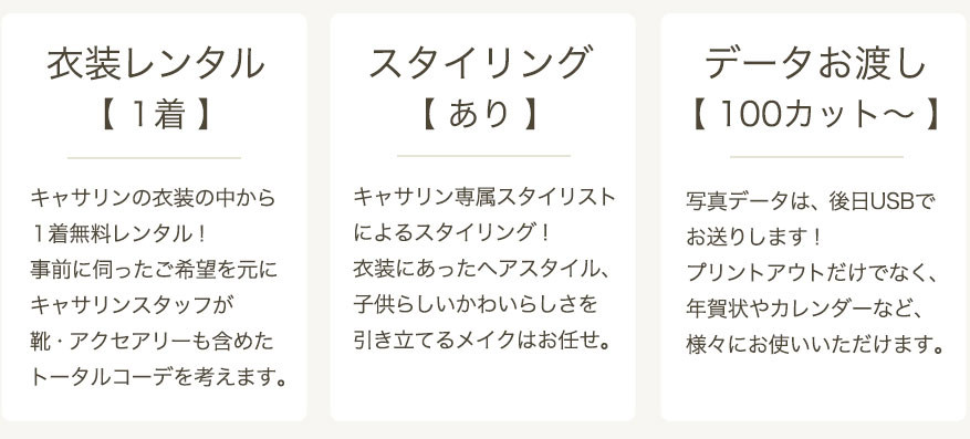 (靴・アクセサリーなどの小物も含め) 衣装は事前に伺うご希望を元に、スタッフがコーディネートいたします。