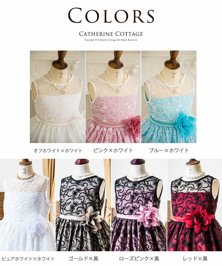 <キーワード> [金][赤][白][ピンク][ダーク][袖なし][ひざ丈・ミディー丈][120/130cm][140/150cm][アナ風ドレス]発表会 結婚式 に レースフォーマルドレス レースフォーマルドレス Catherine Cottage 時には清楚に、時には大胆に 透明感溢れる華やかレースドレス 輸入ドレスらしい絶妙なカラーの生地の上から、 花柄のレース生地をかぶせたドレス。