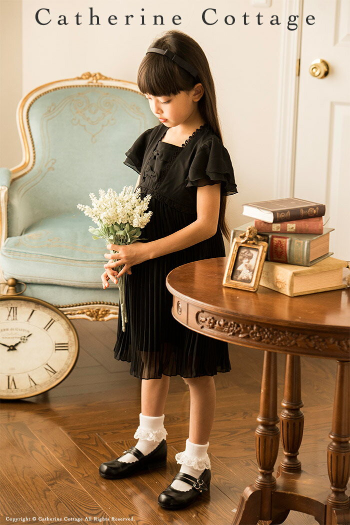 モデル身長:116cm 着用サイズ:120cm コーディネート品(別売り): グログランリボンカチューシャ*日本製折り返しレースソックス*日本製2本ベルトシューズ モデル身長:162cm 着用サイズ:160cm コーディネート品(別売り): ふんわりサテンリボンクリップ*プリンセスパールネックレス*シャンデリアシューズ ※タイツは参考商品です Design ▲黒一色なら、よりフォーマル感が強く、大人っぽい印象に ▲プリーツ部分の水玉で、より明るくカジュアルな印象に ▼大人っぽくV字に切り替えた胸元パネルはスカラップトーションレースで抑え、 リボンも二つ添えてエレガントな印象に ▲フリルのお袖が、肩をやさしくカバー。